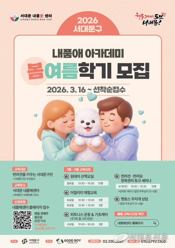 서대문구(구청장 이성헌)가 이달부터 올 12월까지 관내 반려인과 주민을 위한 반려문화 교육 프로그램 ‘2026 내품애아카데미’를 서대문 내품애(愛)센터(모래내로 333)에서 운영한다고 13일 밝혔다.