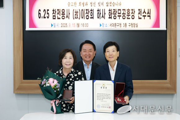 서대문구(구청장 이성헌)는 국방부와 함께 추진 중인 ‘6·25전쟁 무공훈장 주인공 찾기 사업’의 일환으로 최근 고(故) 이장희 하사의 차남 이정수(64) 씨와 자부 한순희(62) 씨에게 화랑무공훈장을 전달했다고 19일 밝혔다.
