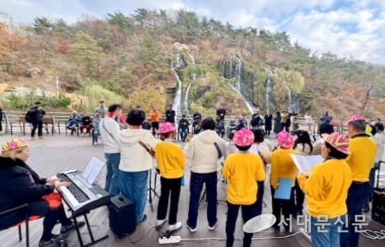 카페폭포 테라스에서 열린 버스킹은 초겨울 햇살 아래 합창과 우쿨렐레 연주가 어우러지며 많은 주민의 호응을 받았다. 특히 외국인을 포함한 관광객들이 공연 장면을 카메라에 담을 정도로 큰 관심이 이어졌다.