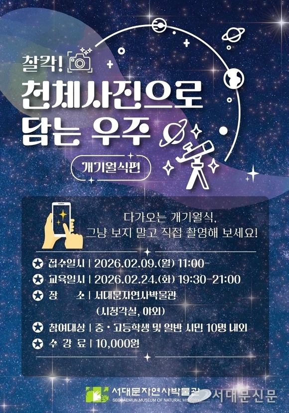 서대문자연사박물관에서는 체험형 강좌인 ‘찰칵! 천체사진으로 담는 우주 – 개기월식 편’을 마련했다고 3일 밝혔다.