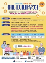 서대문구(구청장 이성헌)는 산업통상자원부와 한국에너지공단이 주관하는 2025년 에너지바우처 사업 대상이 최근 기초수급자 중 다자녀가구로까지 확대됐다고 2일 밝혔다. 에너지바우처란 냉난방 등에 필요한 에너지(전기, 도시가스, 지역난방, 등유, LPG, 연탄 등)를 구입할 수 있는 이용권이다. 이번 확대로 기초생활수급가구이면서 본인 또는 세대원이 ▲노인(65세 이상) ▲영유아(7세 이하) ▲장애인 ▲임산부 ▲중증·희귀·중증난치 질환자 ▲한부모가족 ▲소년소녀가정(가정위탁보호아동 포함) ▲다자녀(19세 미만 자녀 2명 이상) 중 하나에 해당하면 에너지바우처를 지원받을 수 있다. 바우처 신청 기간은 올해 12월 31일까지며 주민등록등본상 거주지의 동주민센터 또는 온라인 복지로 홈페이지(www.bokjiro.go.kr)에서 신청할 수 있다. 거동이 불편해 방문 신청이 어려운 경우 공무원의 직권 신청 또는 대리인 신청이 가능하다. 지원금액은 1인 가구 295,200원, 2인 가구 407,500원, 3인 가구 532,700원, 4인 이상 가구 701,300원으로 세대원 수에 따라 다르게 지급한다. 자세한 내용은 에너지바우처 콜센터(1600-3190), 거주지 동주민센터,