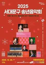 서대문구(구청장 이성헌)가 한 해를 마무리하는 시기에 따뜻한 감동을 전하는 ‘2025년 행복과 화합의 송년 음악회’를 개최한다. 누구나 즐길 수 있는 공연으로 12월 20일 토요일 오후 5시부터 약 100분간 이화여자대학교 대강당에서 다채롭게 진행된다. 이날 무대에는 서대문구 곳곳에서 클래식 문화를 전파하며 주민들에게 행복을 선사하는 ‘서대문 오케스트라 - 함신익과 심포니송’이 출연한다. 또한 서대문구립여성합창단, 인천시립합창단, 소프라노 김순영, 메조소프라노 김선정, 테너 이명현, 베이스 정인호가 협연한다. 레퍼토리는 천사의 캐럴, 펠리스 나비다(Feliz Navidad), 크리스마스 페스티벌, 오 거룩한 밤 등 다양한 겨울 노래로 구성된다. 지휘자 함신익은 설명을 곁들인 진행으로 관객들의 곡 이해를 돕는다. 음악회 대미는 베토벤 교향곡 9번 ‘합창’ 4악장으로 장식한다. 무료 공연으로 관람 희망자 누구나 12월 1일 오전 10시부터 서대문구청 홈페이지(분야별정보→통합온라인신청→신속신청)를 통하거나 서대문구청 문화체육과(02-330-1410)로 전화해 선착순 신청할 수 있다. 이성헌 구청장은 “한 해를 돌아보고 새해를 준비하는 때에 관객분들께 일상의 따뜻한